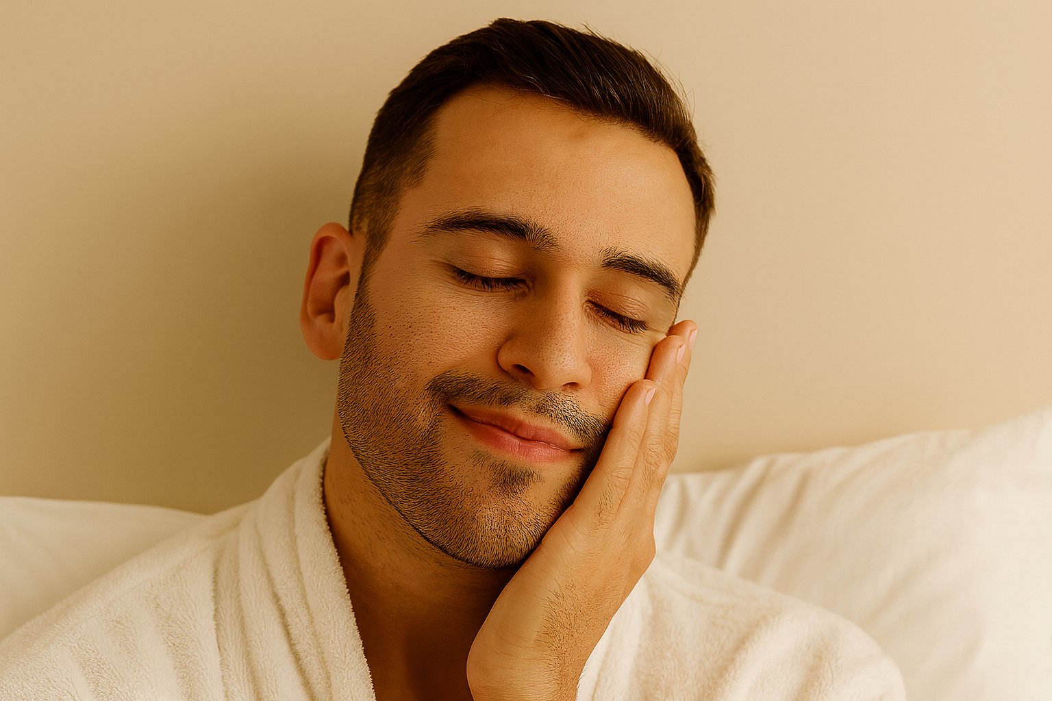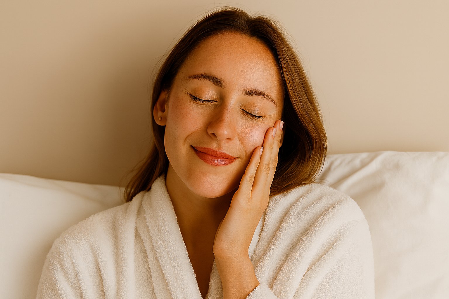 Woman enjoying morning coffee in bed wearing a white robe, highlighting healthy daily routine for radiant, plump, soft, smoother skin and ultimate hydration using anti-aging skincare products.