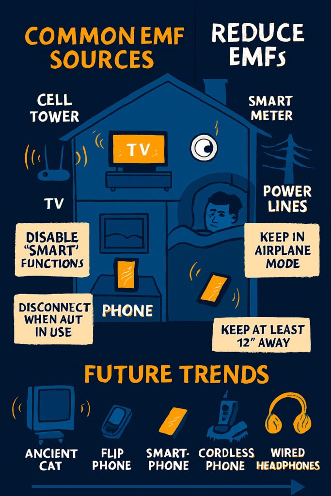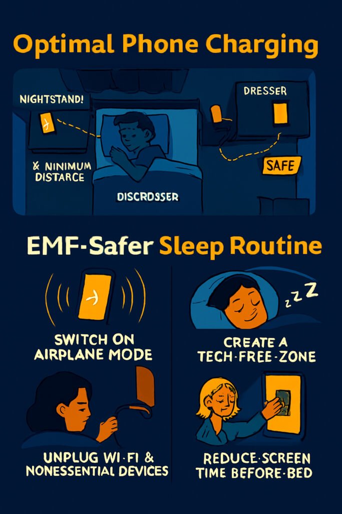 • Maintain good sleep hygiene. Consistent sleep schedule, dim lighting, and calming activities improve sleep quality alongside EMF reduction.